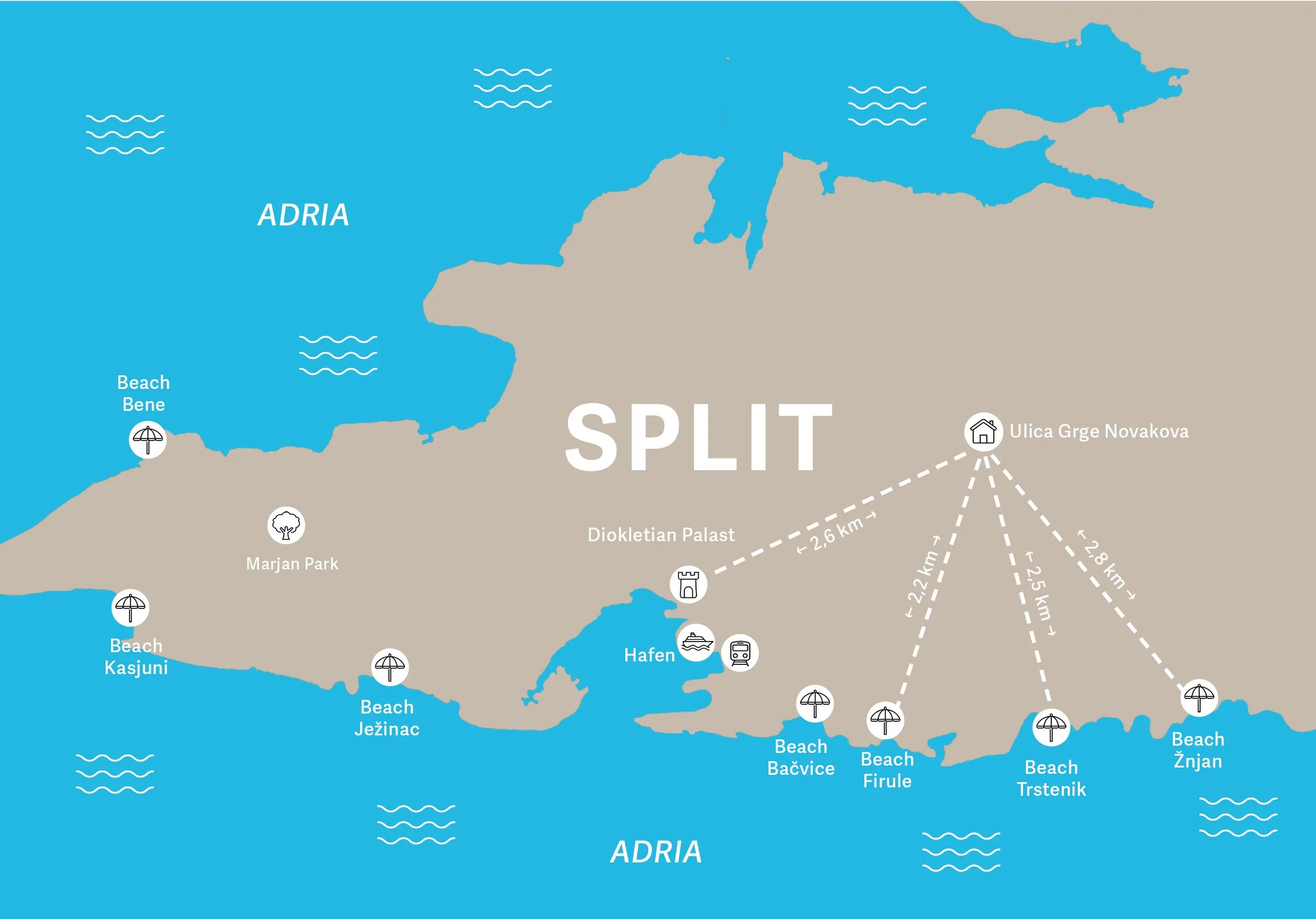 Die Wohnung bietet Platz (85qm) und Komfort für 4 Personen in einem ruhigen und ursprünglichen Wohngebiet in Split. Sie befindet sich in einem Mehrfamilienhaus mit 3 Parteien auf der 1. Etage und besteht aus 2 Schafzimmern (1 Doppelbett und 2 Einzelbetten), einem Duschbad und einem offenem, geräumigem, klimatisiertem Wohn-/Ess-/Küchenbereich. Vor dem Haus steht bei Bedarf ein Privatparkplatz zur Verfügung. In 7 min erreicht man mit dem Auto den nächsten Stadtstrand. Supermärkte und Cafes sind fußläufig zu erreichen. An der nah gelegenen Bushaltestelle (Entfernung ca. 5 min) fahren regelmäßig Busse in das historische Stadtzentrum und die Altstadt Splits mit ihren vielen Sehenswürdigkeiten (Busfahrt ca. 15 min). Mehr Informationen über die Stadt Split erfahrt ihr hier: www.visitsplit.croatia.hr